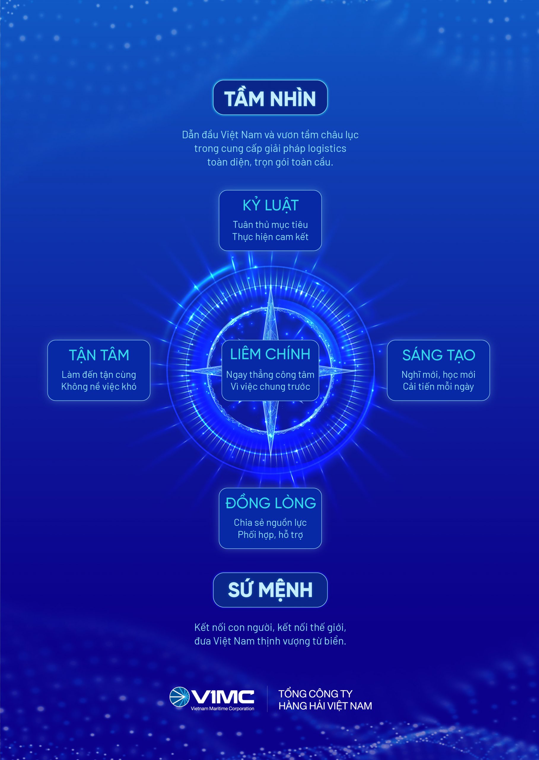 Tinh thần này đã được đưa vào cuốn Sổ tay văn hóa “Thịnh vượng từ Biển”, đúc kết những giá trị, khát vọng và hành động thực tế của người VIMC. Đồng thời, VIMC xây dựng biểu tượng “La bàn văn hóa” với 5 giá trị cốt lõi rõ ràng: Kỷ luật, Tận tâm, Sáng tạo, Đồng lòng và Liêm chính. Đây trở thành kim chỉ nam cho mọi quyết định và hành động.