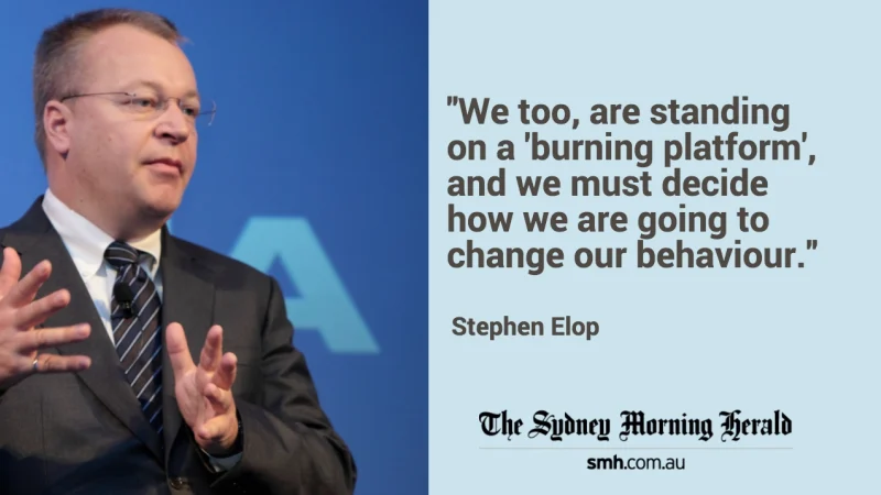 Khái niệm này bắt nguồn từ bản ghi nhớ nổi tiếng của Stephen Elop, CEO Nokia, nhằm cảnh tỉnh đội ngũ lãnh đạo rằng họ đang bị AppleAndroid đe dọa nghiêm trọng. Elop viết: “Chúng ta đã bỏ lỡ nhiều cơ hội. Chúng ta không đổi mới đủ nhanh. Chúng ta thiếu sự hợp tác nội bộ. Nền tảng của Nokia đang cháy.”
