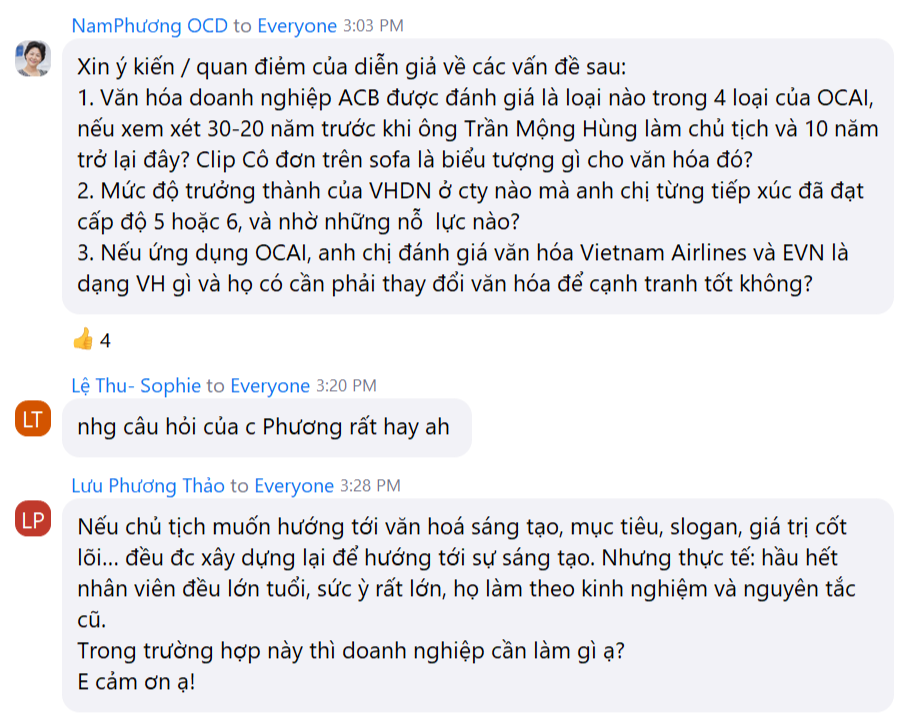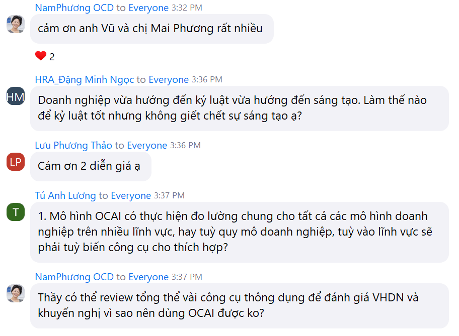 Cuối buổi tọa đàm, phần hỏi đáp giữa người tham gia và diễn giả là hoạt động tương tác quan trọng và hết sức hấp dẫn. Các câu hỏi từ các cá nhân tham dự không chỉ mang tính thực tế mà còn rất liên quan đến các sự kiện nổi bật gần đây. Trong tinh thần tận tâm và chuyên nghiệp, hai diễn giả đã trả lời các câu hỏi này, mang lại cho người tham gia một góc nhìn thực tế và sâu sắc hơn về vấn đề văn hóa doanh nghiệp. Một số câu hỏi được đặt ra với diễn giả tại buổi tọa đàm online hết sức thú vị và thực tiễn: