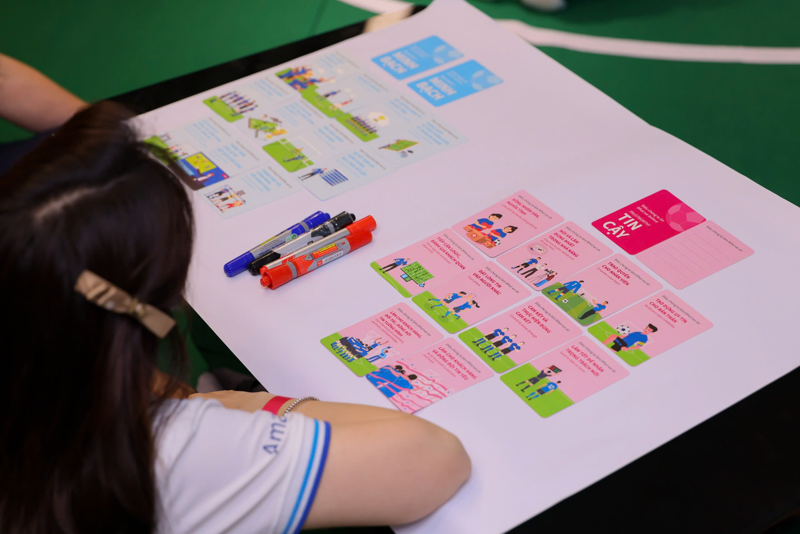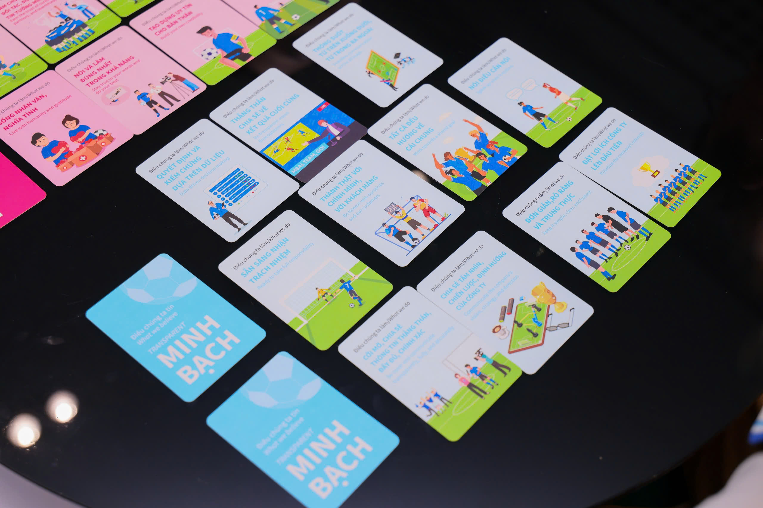 Công cụ này giúp tiết kiệm thời gian, tối ưu hóa quá trình thảo luận và đi thẳng vào trọng tâm. Nhưng điều quan trọng hơn cả là cách mỗi thành viên trong nhóm liên tục nhấc lên, đặt xuống từng thẻ bài, tranh luận về ý nghĩa thực sự của từng hành vi, để cuối cùng đi đến sự thống nhất chung. Đây chính là lúc giá trị cốt lõi không còn là lý thuyết, mà trở thành kim chỉ nam cho hành động thực tế.